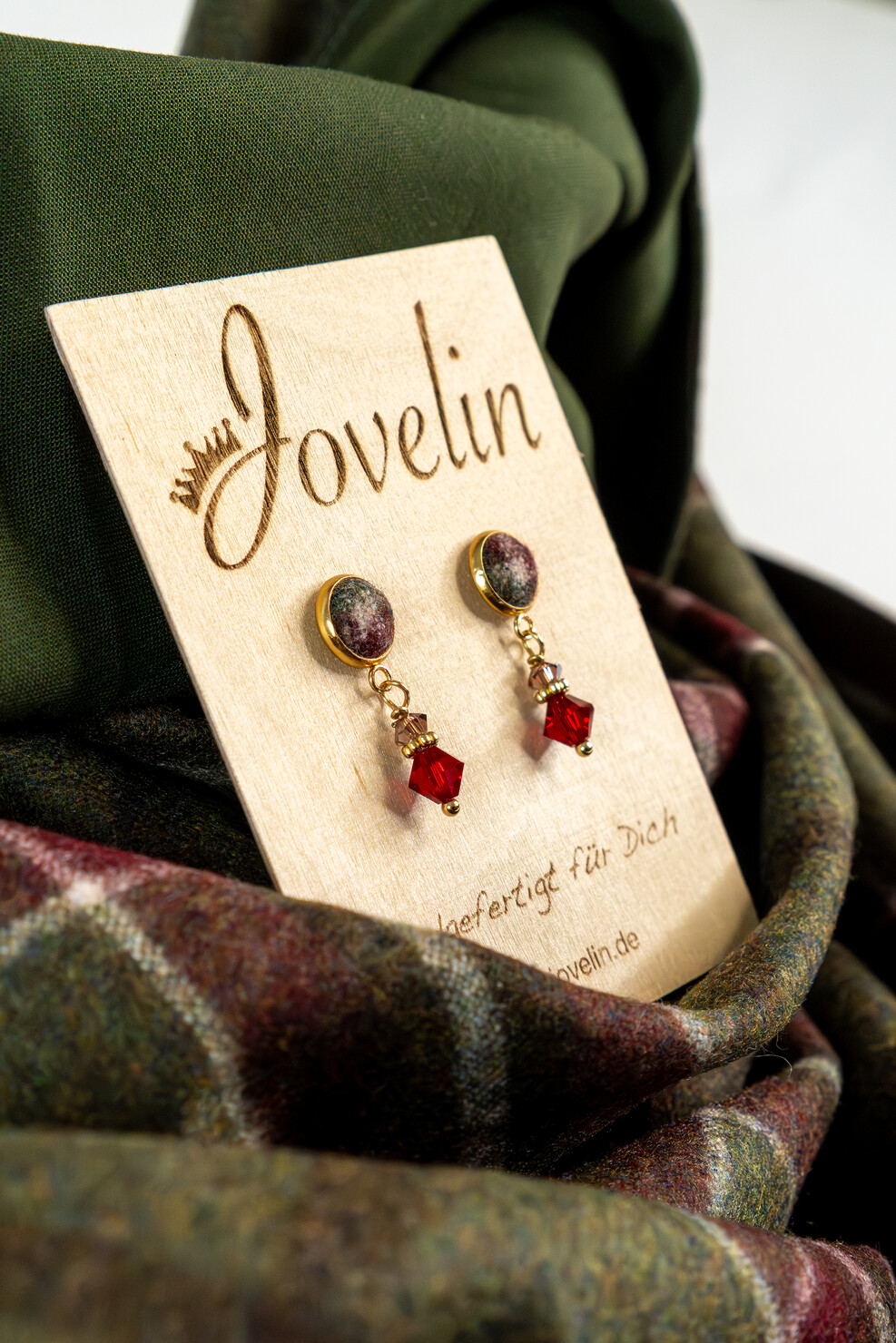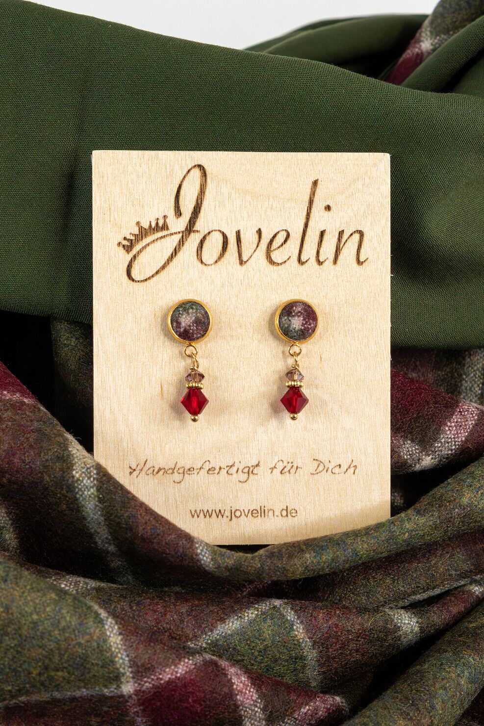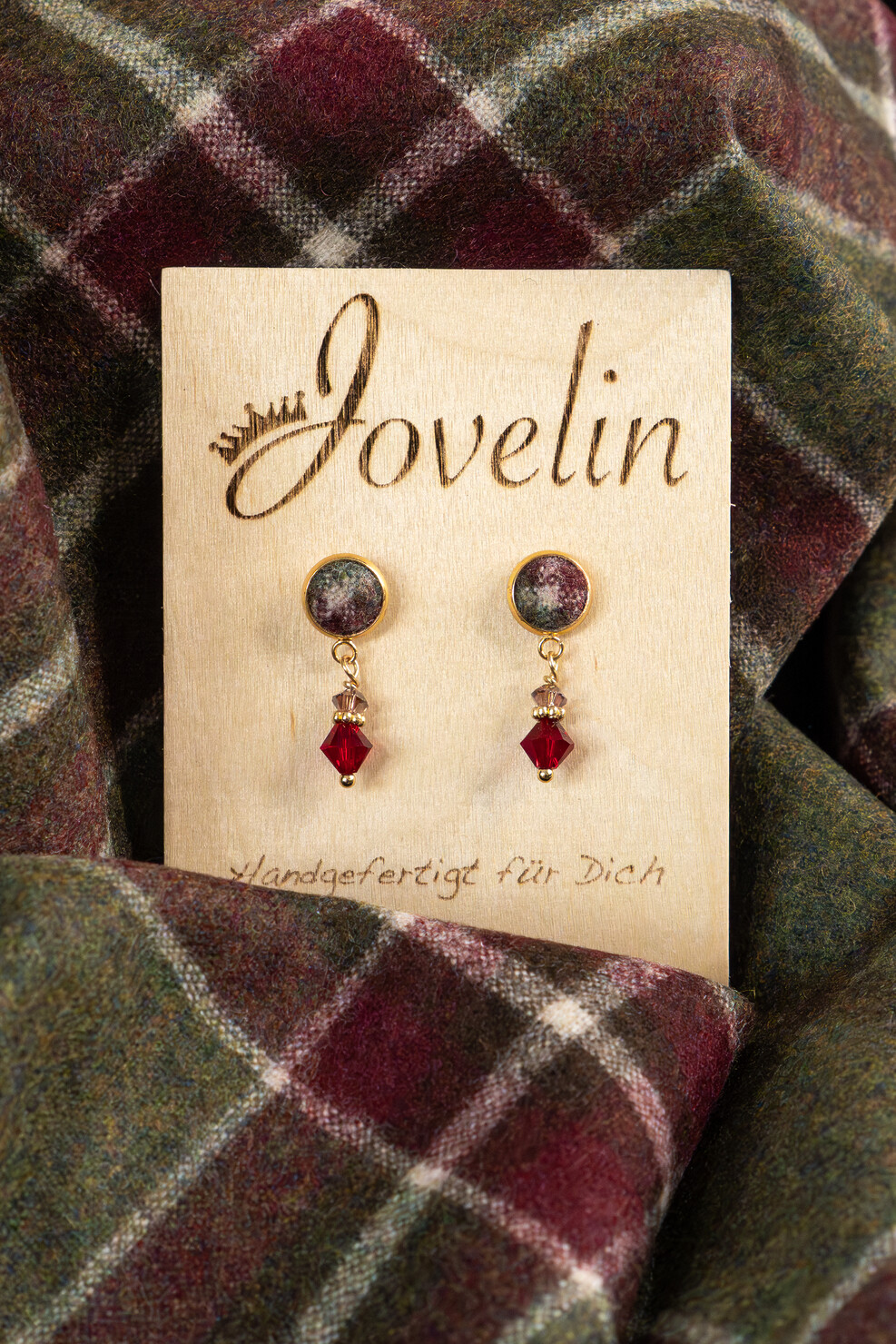 Das außergewöhnliche Karomuster aus grünem Loden, kombiniert mit einem warmen Rotton und zartem Creme, wurde exklusiv nach unserem Entwurf hergestellt – und macht jeden Ohrring zu einem besonderen Unikat.
